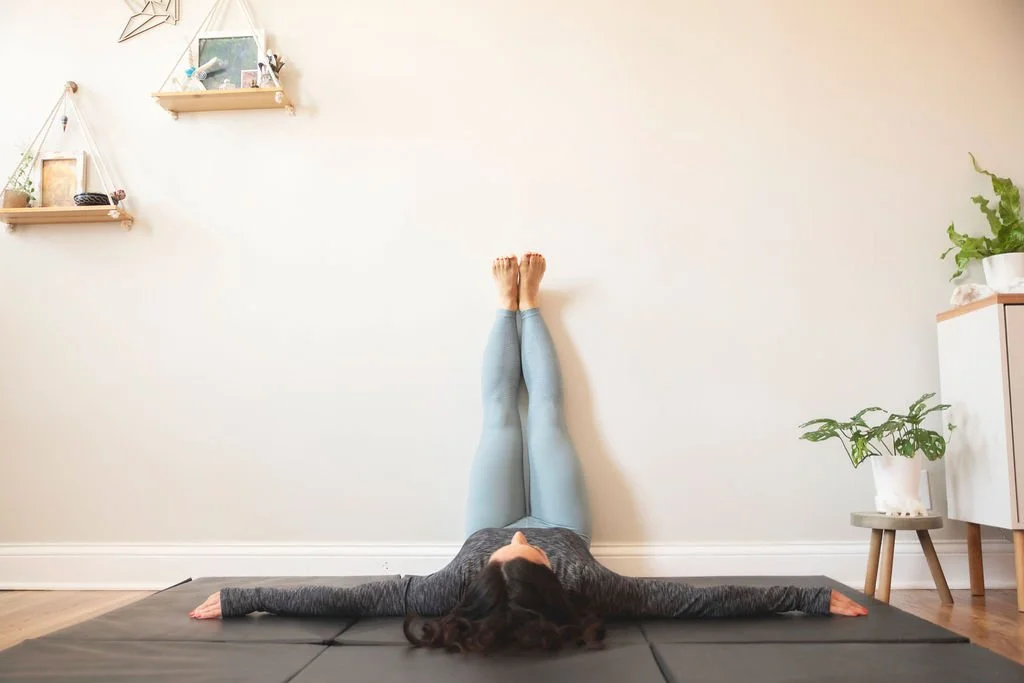 Basically, Legs Up the Wall posture is exactly as it sounds! You lie on your back with your sit-bones as close to the wall as possible. From here, extend your legs up the wall, so that the backs of your legs are resting comfortably against it. Now hang out and RELAX!!!